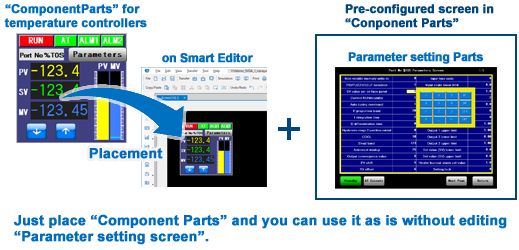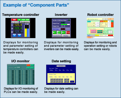 复合配件是指将多个元件组合为一项功能的综合体。只需从一览表中选择并配置已经设定了必要功能及宏的复合配件,即可直观制作出各种功能画面。
