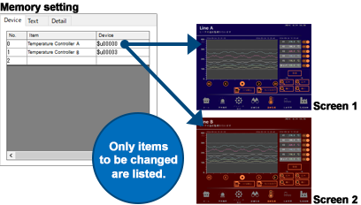 多个画面使用相同的地址或文本时,将其登录到复合配件的内存/文本表格。只需显示、变更设定视窗,即可变更多个画面的设定。
