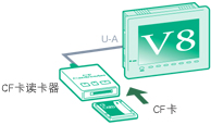 加上内置的CF卡接口,还可以对应USB连接的CF卡读卡器,可同时使用。两个CF卡之间可以进行文件复制,不会妨碍V8的运行。可根据用途选择多种使用方式。