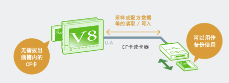 将CF卡当作内置驱动器使用,可以利用USB接口将内置驱动器的数据复制到其他CF卡中。插槽内的CF卡可直接进行高效率地备份采样数据或配方数据等。