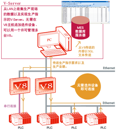 自V8通过V-Server把生产业绩的统计以及不合格产品的数量、停止原因等各种信息以SQL文本传送到数据库。与数据库之间的通讯,无需通过网关计算机以及繁琐的程序设计即可实现。