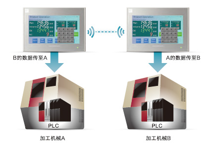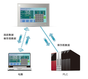 通过无线LAN 连接电脑与V9系列,可进行画面数据的传输、对连接于V9 系列的PLC 可传输梯形图。无需连接电缆,因此现场的调试排错也可简单完成。
