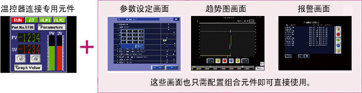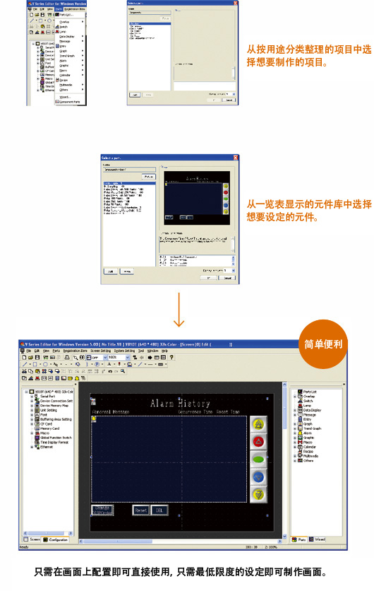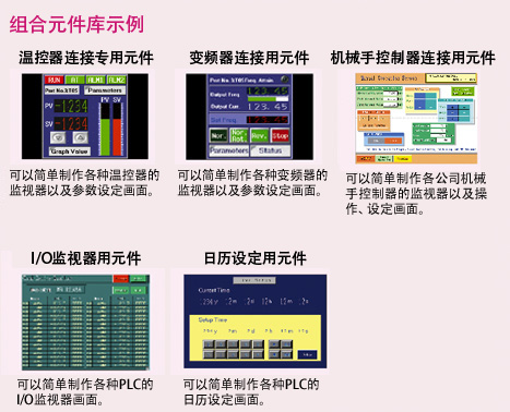 由于事先准备好了各种组合元件,可以根据用途从组合元件一览中选择,简单制作拥有多种功能的画面。