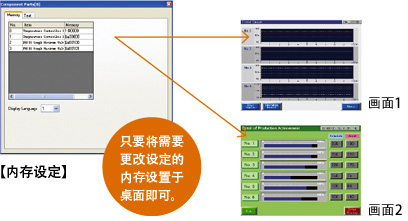 即使由多个画面构成的画面程序,利用组合元件只需选择并配置元件文件,所有画面即可直接利用。而且配置现有画面时,也不必担心覆盖层及信息等各种设定的重复。