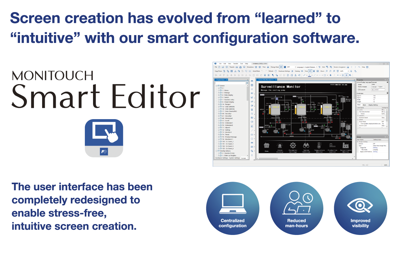 Configuration, from the entire project to individual screens, is consolidated into Project View, and individual settings into Properties.The flow of left to right enables quick, intuitive configuration.