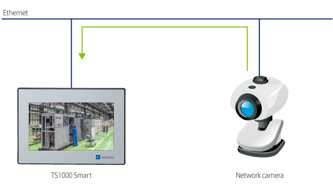 Display video from a network camera connected via Ethernet with TS1000 Smart. TS1000 Smart can also monitor factory floors.