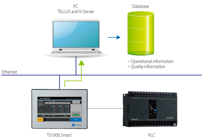 Collect broad information to store in the server database from production performance to defects and the causes of stoppages with TS1000 Smart through the V-Server.