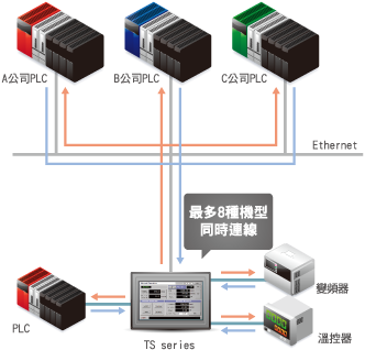 包含Ethernet連接與串列連接,最多8種不同機型、品牌的PLC及其他的週邊設備間可同時連線。