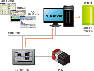 從「TECHNOSHOT」經由V-Server所收集的生產業績、不良、停止原因等各種資訊納入伺服器的資料庫裡。