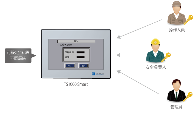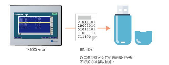 透過按鈕操作和數值輸入等畫面上的操作,按照時間順序作記錄。與安全功能組合可以確認「何時、誰、什麼原因」,對異常原因分析非常有幫助。
