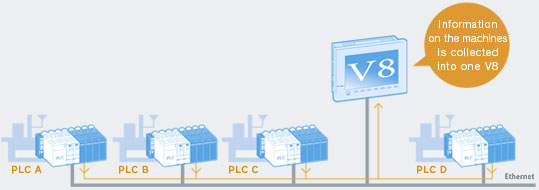 A production line that contains various manufacturers' equipment has various types of PLCs. By using 8-way communication, you can monitor the condition of all the PLCs through a V8 and analyze trouble at a remote place without visiting the site.