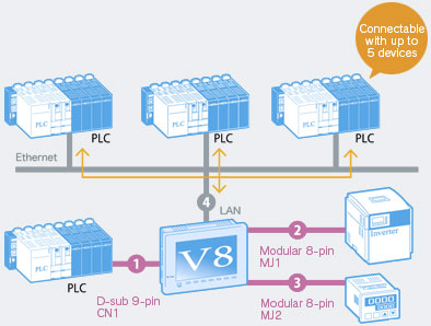 8-way communication enables connection among a V8 and up to eight kinds of devices consisting of PLCs and peripherals of different manufacturers.