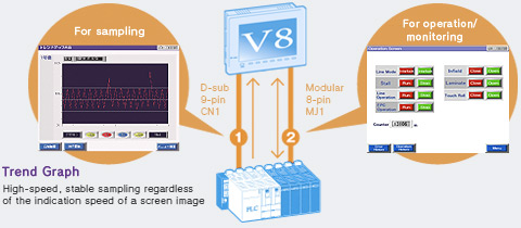 The V8 is connected to the PLC via two communication lines: one for operation/monitoring, and the other for sampling, a setup that enables high-speed, stable sampling.