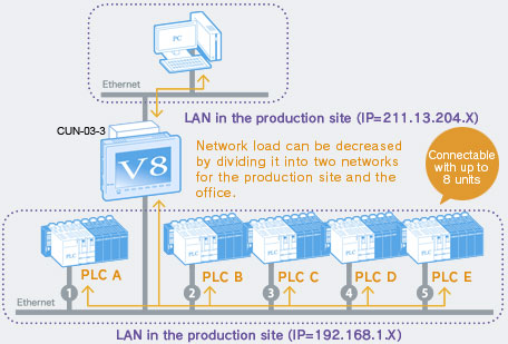 For example, data can be transferred between the production site and the office freely by using a V8. V8 works as the gateway of multiple networks of the production site and the office without increasing data load on the networks.