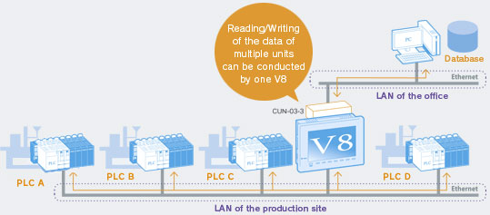 Even when the system consists of various kinds of equipment, it is easy to read and write the data of the individual units via 8-way communication. By using a V8 as a gateway, it is possible to connect with the office host system.
