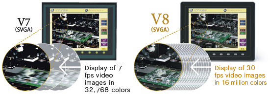 High-resolution display of 65,536 colors without blinks and 32,768 colors with blinks enables clear display of JPG and BMP images. Realistic appearance of photos, illustrations and 3D parts improves visibility and makes it easy for operators to quickly grasp the conditions.