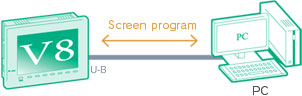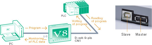 PLC ladder programs can be edited or monitored with your PC through the USB port of a V8. High-speed ladder transfer is possible.