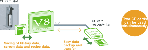 In addition to the built-in CF card interface, MONITOUCH is equipped with a USB interface for a CF card reader/writer, which can be used simultaneously. Since CF card data can be copied to another card while V8 is being used, the V8 performance will not be inhibited. These functions expand the versatility of MONITOUCH.