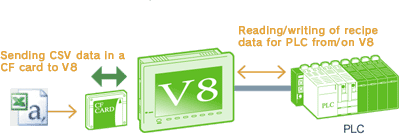 Production conditions can be saved in a CF card in CSV format. For preparation of production, data can be read out from a CF card and written in the PLC. It is also possible to read out data from PLC.