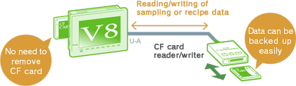 While using a CF card as a built-in drive, the card data can be copied to another CF card via the USB interface. Sampling data and recipe data can be backed up easily while keeping the CF card in the slot.
