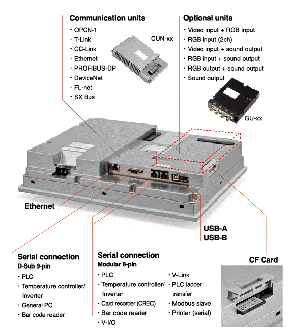 | Modular 8-pin (MJ1/ MJ2) | RS-232C, RS-422/485 (two-wire system), Asynchronous type, Data length : 7,8 bits, Parity : even, odd, none, Stop bit : 1,2 bits, Baud rate : 4800, 9600, 19200, 38400, 57600, 76800, 115200bps | |