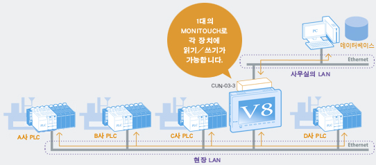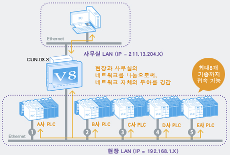 1 대의 V8로 8기종 PLC와 Ethernet접속이 가능합니다. 그리고 옵션 유닛(CUN-03-3)을 장착하여 Ethernet포트를 2포트로 증설함으로써, 게이트웨이로서 사용 가능합니다.