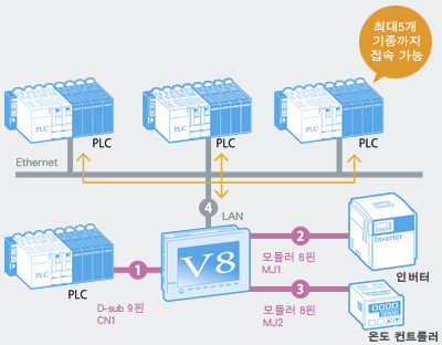 8Way통신은 Ethernet에 의한 접속(8프로토콜)과 시리얼에 의한 접속(3프로토콜)을 조합하여 최대 8기종의 타기종 타사 PLC 및 기타 주변기기와의 접속을 1대의 V8로 가능하게 합니다.