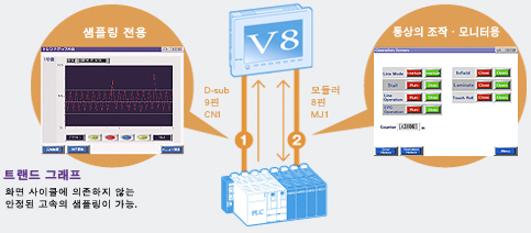 통신포트를 2포트로 나누어서 접속합니다. 하나는 통상의 조작/모니터용으로, 타 하나는 샘플링 전용으로 설정함으로써, 안정된 고속의 샘플링을 실현.