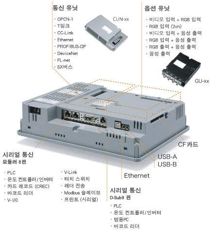 | 모듈러 8핀 (MJ1/MJ2) | RS-232C 또는 RS-422/RS-485(2선식) 조보동기식 데이터 비트:7,8비트 패리티: 홀수, 짝수, 없음 정지 비트:1,2 비트 전송속도:4800, 9600, 19200, 38400, 57600, 76800, 115200bps | ||||