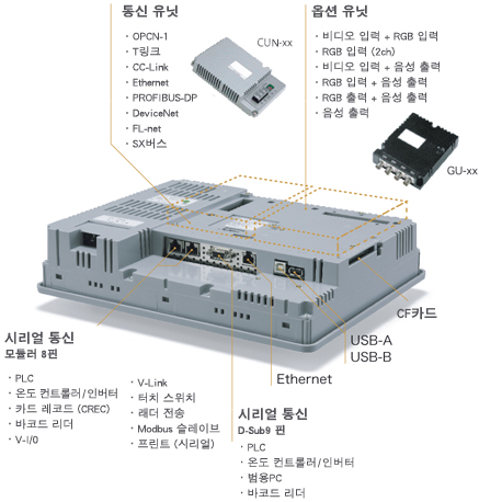 | 모듈러 8핀 (MJ1/MJ2) | RS-232C 또는 RS-422/RS-485(2선식) 조보동기식 데이터 비트:7,8비트 패리티: 홀수, 짝수, 없음 정지 비트:1,2 비트 전송속도:4800, 9600, 19200, 38400, 57600, 76800, 115200bps | |