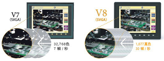 無閃爍時65,536色,有閃爍時32,768色的高畫質顯示,即使JPG,BMP影像也可清晰易見。透過即時顯示照片,插圖,3D元件等,提高可視性。易於操作者判斷狀況。