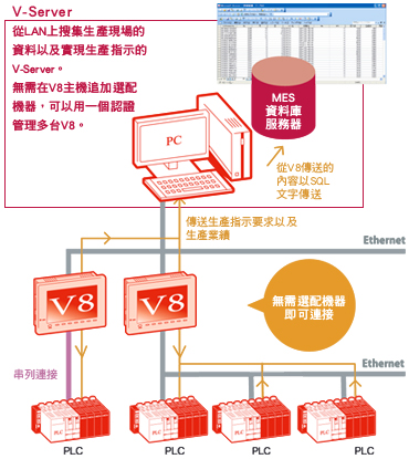自V8透過V-Server把生産業績的統計以及不合格産品的數量,停止原因等各種資訊以SQL文字傳送到資料庫。與資料庫之間的通訊,無需透過閘道電腦以及繁瑣的程式設計即可實現。