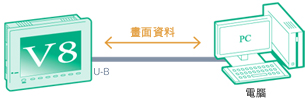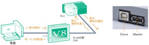 透過V8的USB埠從電腦寫入階梯圖程式及監控。充分利用USB埠的優勢,實現更高速的階梯圖傳送。