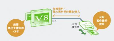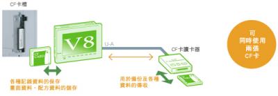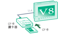 除了内建的CF卡介面,還對應USB連接的CF卡讀卡器,兩種可同時使用。兩張CF卡之間可進行檔案複製,且不影響V8的動作。可根據用途選擇多種使用方式。