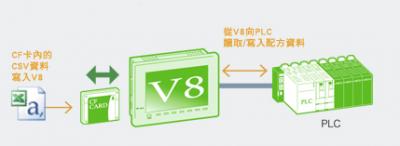 配方資料按照生產項目將生產條件以CSV 形式儲存在CF 卡中。更換程序時可從CF 卡中讀取,並寫入PLC 內。而且還可從PLC 中讀取。