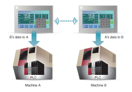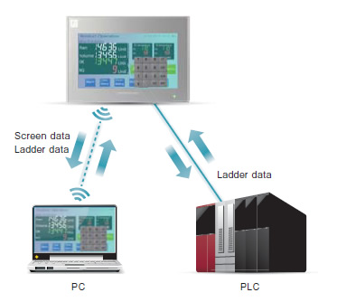 By connecting a PC to a V9 via wireless LAN, screen data can be shared and ladder programs transferred to the PLC. With no need to physically connect the units, it is easy to debug programs on site.