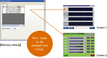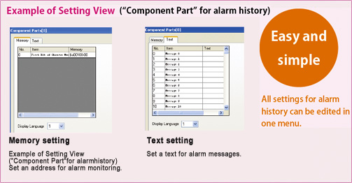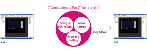 When the same address or text is used for multiple screens, all the settings can be changed simultaneously on the setting view simply by registering it in the address/text table of a "Component Part."